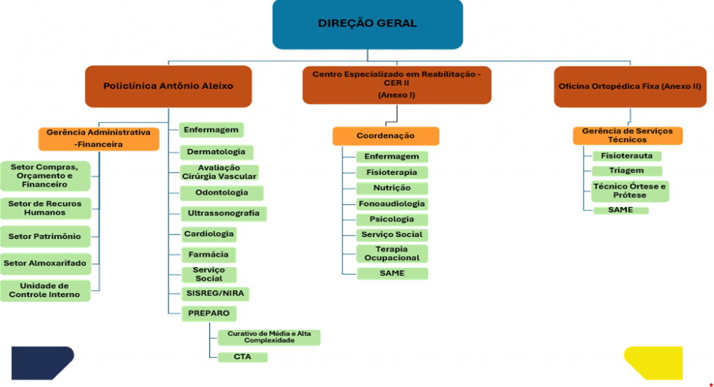 Tem uma área construída de 1.050 m² subdividida em três prédios, sendo o primeiro destinado ao ambulatorial médico, odontológico e enfermagem, o segundo prédio destinado ao Centro Especializado em Reabilitação Antônio Aleixo (CER II) e o terceiro a Oficina Ortopédica Fixa (OOF).